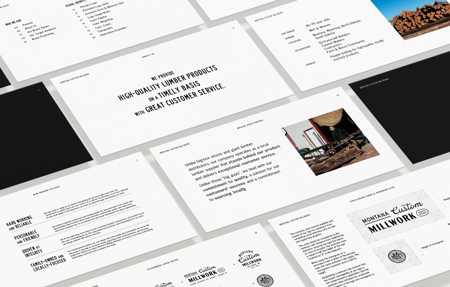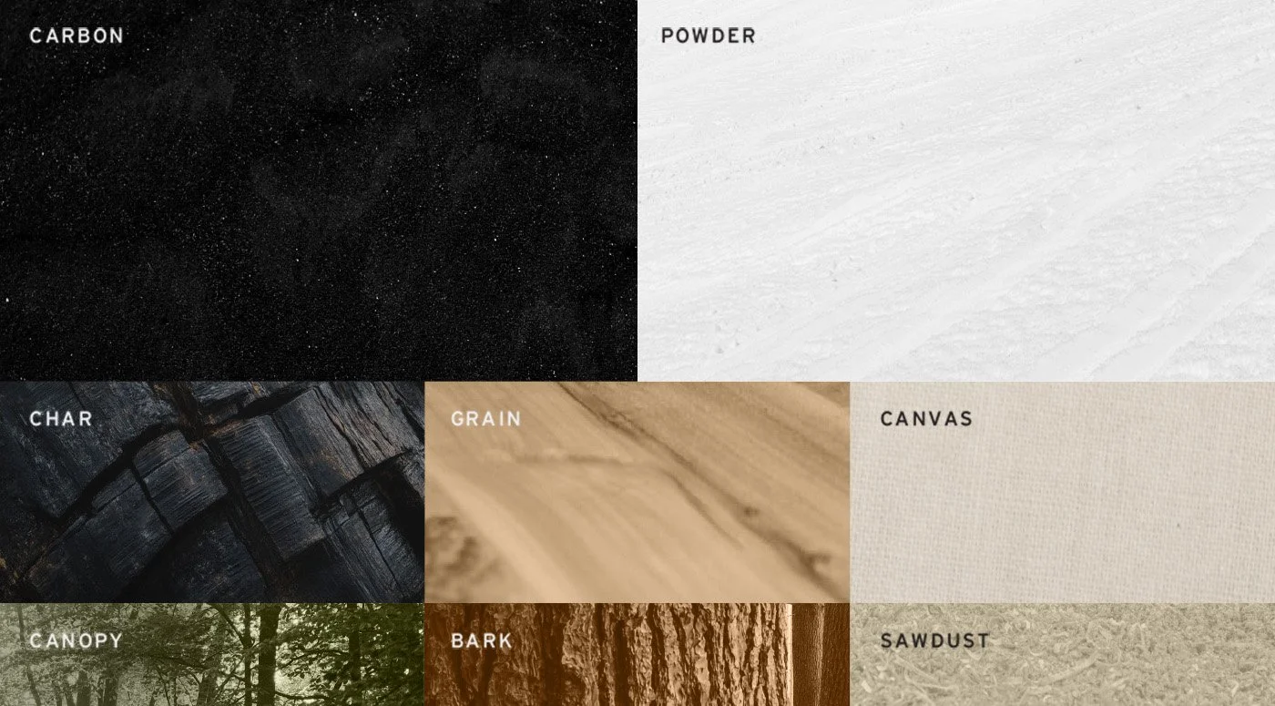 The resulting brand system draws directly from the materials they work with: layered woodgrain textures echo the tactile nature of their craft, while a Montana-shaped lockup anchors the identity in its home soil. From the material-driven color palette to the tree-ring monogram, each detail works together to form a rugged, hard-working identity built with the same intention as the products they create.